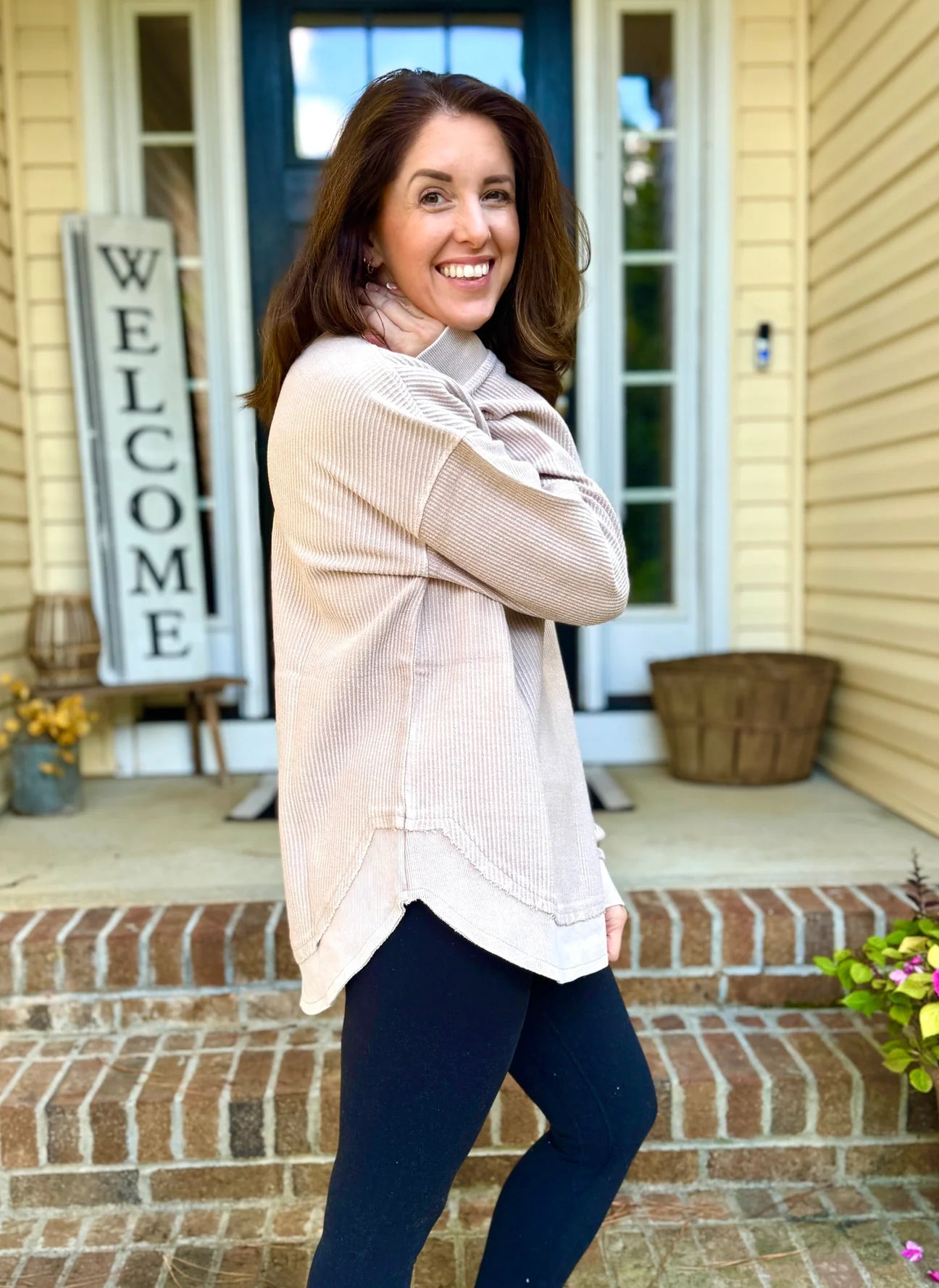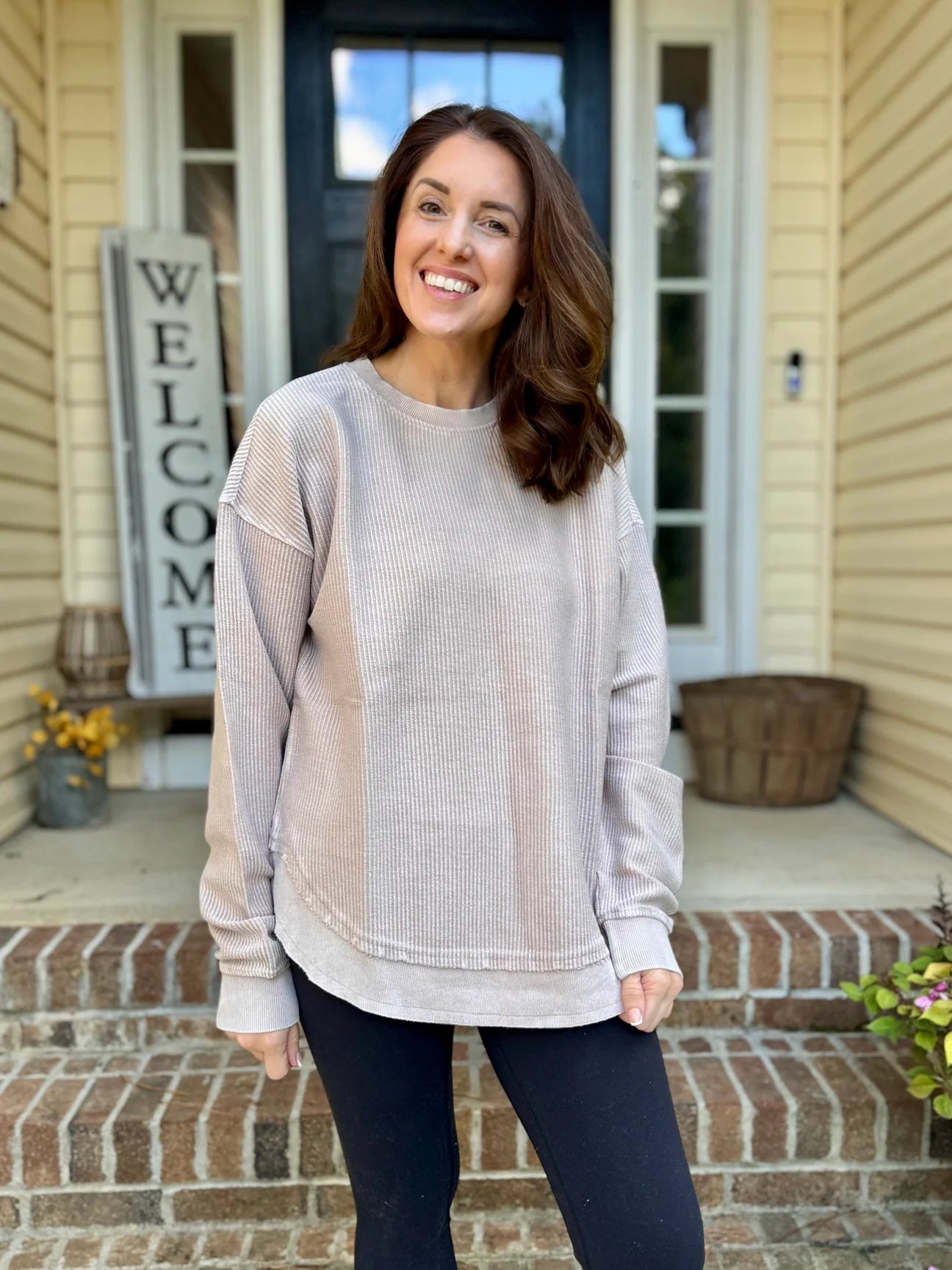 A must have closet essential!Oversized fit features a ribbed crew neckline, cuffs and ribbing along a scooped bottom.