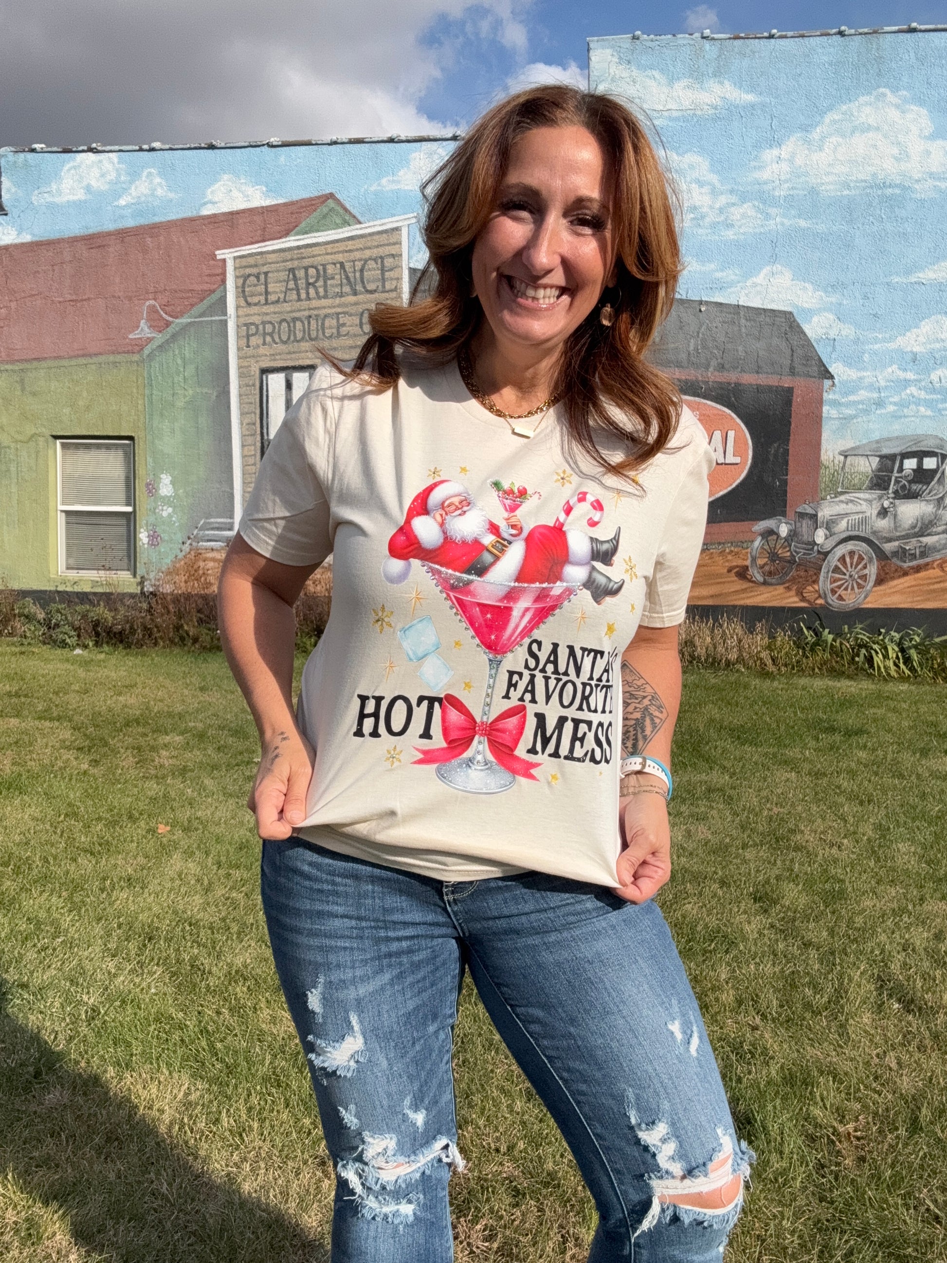 Bring on the holiday cheer (and a little sass) with our Santa’s Favorite Hot Mess Tee! This festive custom-made top features a playful Santa lounging in a martini glass — complete with sparkling crystal embellishments for that extra holiday shimmer. Crafted from 100% premium cotton in a soft natural hue, this tee offers comfort, style, and a cheeky dose of personality. Proudly made in the USA, it’s perfect for pairing with your favorite denim, cozy shackets, or glittery accessories for all your merry mischief moments!