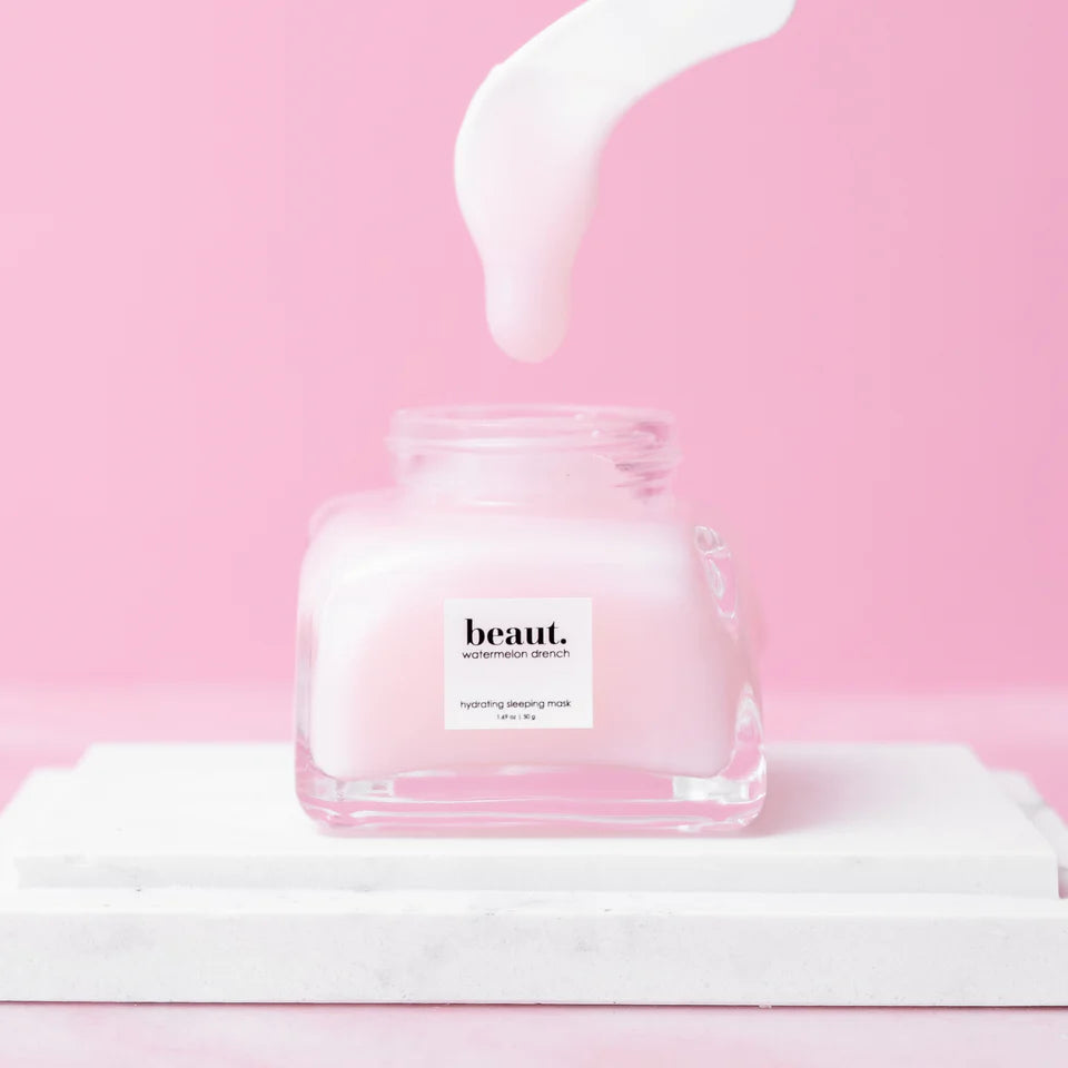 The Watermelon Drench sleeping mask is enriched with watermelon extracts, hyaluronic acid, and Alpha Hydroxy Acids (AHAs), this mask redefines skincare innovation. Its bouncy, breathable texture harnesses watermelon's amino acids and vitamins to deeply hydrate, soothe, and shield your skin against dryness and pollution.